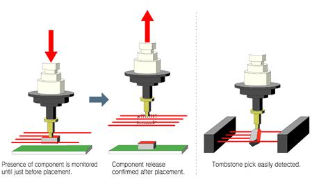 Since the laser is mounted on the head, it can be used to monitor the presence of components the entire time from pick to placement. This is difficult to accomplish with vacuum detection only. The placement reliability is also improved because the release of the component is confirmed after placement.